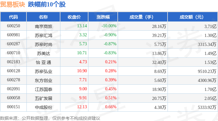 证券之星消息,12月22日贸易板块较上一交易日下跌0.33%,南京商旅领跌。当日上证指数报收于3917.36,上涨0.69%。深证成指报收于13332.73,上涨1.47%。贸易板块个股涨跌见下表: