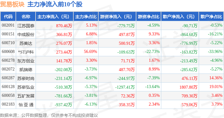从资金流向上来看,当日贸易板块主力资金净流出7715.28万元,游资资金净流入503.83万元,散户资金净流入7211.45万元。贸易板块个股资金流向见下表: