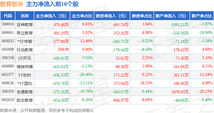 从资金流向上来看,当日教育板块主力资金净流出2.64亿元,游资资金净流入1.25亿元,散户资金净流入1.39亿元。教育板块个股资金流向见下表: