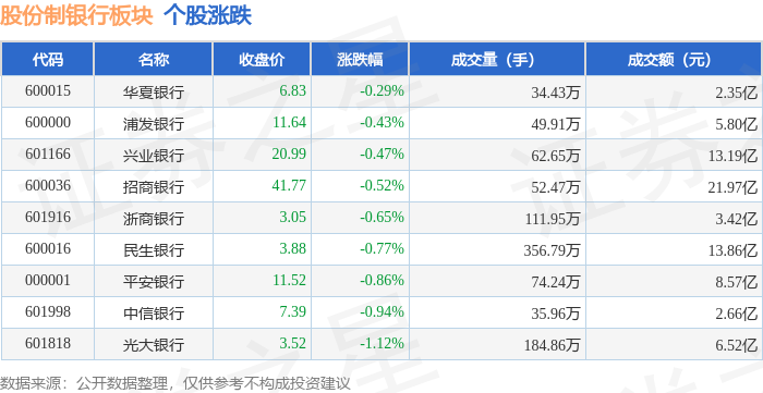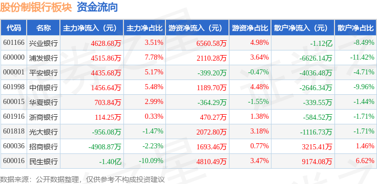 从资金流向上来看,当日股份制银行板块主力资金净流出3994.56万元,游资资金净流入1.81亿元,散户资金净流出1.41亿元。股份制银行板块个股资金流向见下表: