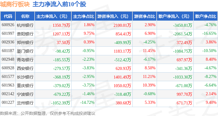 从资金流向上来看,当日城商行板块主力资金净流出3.52亿元,游资资金净流入4.29亿元,散户资金净流出7663.76万元。城商行板块个股资金流向见下表: