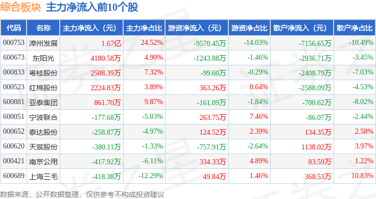 从资金流向上来看,当日综合板块主力资金净流入1.31亿元,游资资金净流出1.14亿元,散户资金净流出1747.33万元。综合板块个股资金流向见下表: