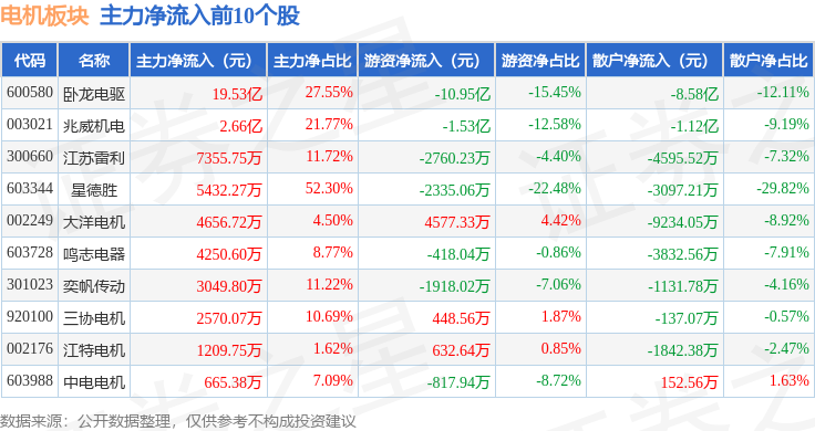 从资金流向上来看,当日电机板块主力资金净流入24.39亿元,游资资金净流出12.43亿元,散户资金净流出11.95亿元。电机板块个股资金流向见下表: