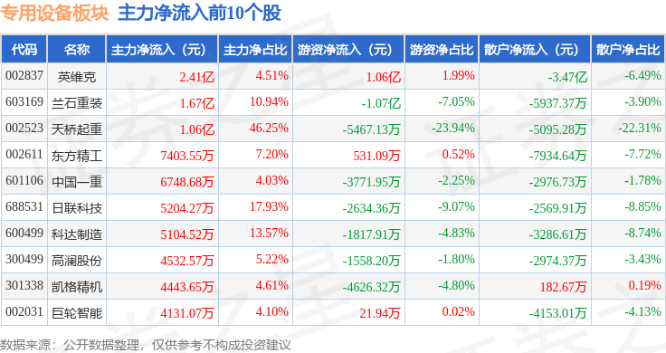 从资金流向上来看,当日专用设备板块主力资金净流出1.28亿元,游资资金净流出7926.44万元,散户资金净流入2.07亿元。专用设备板块个股资金流向见下表: