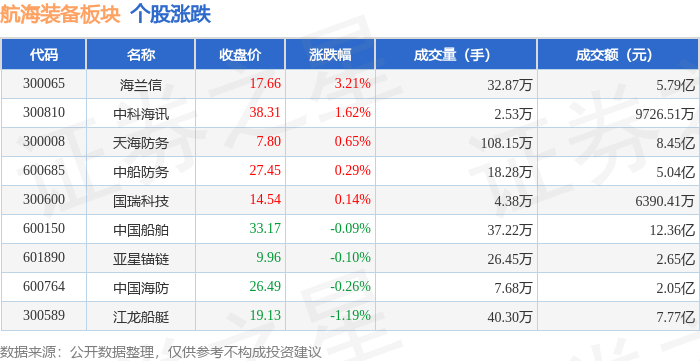 证券之星消息,12月22日航海装备板块较上一交易日上涨0.07%,海兰信领涨。当日上证指数报收于3917.36,上涨0.69%。深证成指报收于13332.73,上涨1.47%。航海装备板块个股涨跌见下表: