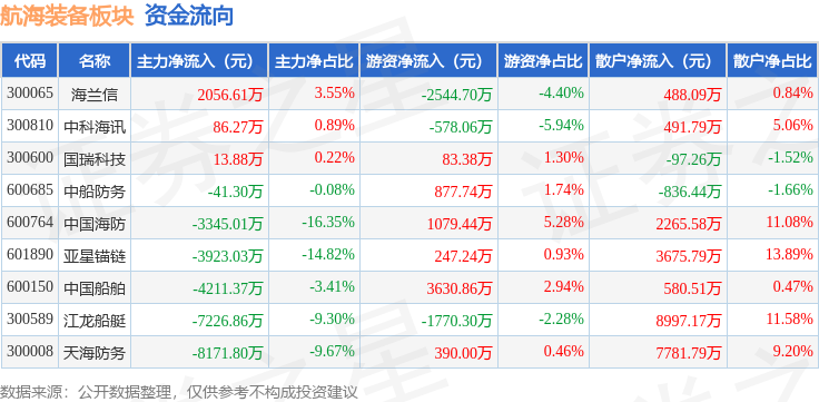 从资金流向上来看,当日航海装备板块主力资金净流出2.48亿元,游资资金净流入1415.61万元,散户资金净流入2.33亿元。航海装备板块个股资金流向见下表: