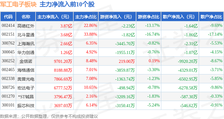 从资金流向上来看,当日军工电子板块主力资金净流入7.04亿元,游资资金净流出8.55亿元,散户资金净流入1.51亿元。军工电子板块个股资金流向见下表: