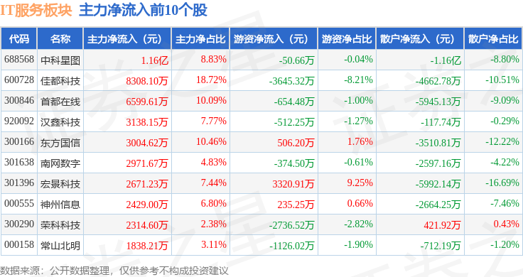 从资金流向上来看,当日IT服务板块主力资金净流出9.76亿元,游资资金净流入1.51亿元,散户资金净流入8.25亿元。IT服务板块个股资金流向见下表:
