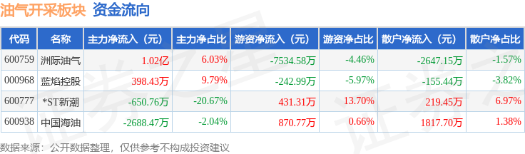 从资金流向上来看,当日油气开采板块主力资金净流入7240.93万元,游资资金净流出6475.49万元,散户资金净流出765.43万元。油气开采板块个股资金流向见下表: