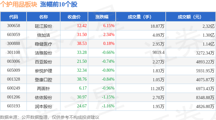 证券之星消息,12月22日个护用品板块较上一交易日下跌0.62%,中顺洁柔领跌。当日上证指数报收于3917.36,上涨0.69%。深证成指报收于13332.73,上涨1.47%。个护用品板块个股涨跌见下表: