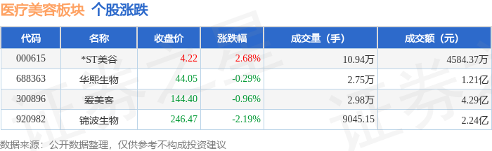 证券之星消息,12月22日医疗美容板块较上一交易日下跌0.49%,锦波生物领跌。当日上证指数报收于3917.36,上涨0.69%。深证成指报收于13332.73,上涨1.47%。医疗美容板块个股涨跌见下表: