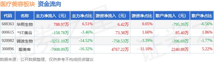 从资金流向上来看,当日医疗美容板块主力资金净流出6377.9万元,游资资金净流入4847.01万元,散户资金净流入1530.89万元。医疗美容板块个股资金流向见下表: