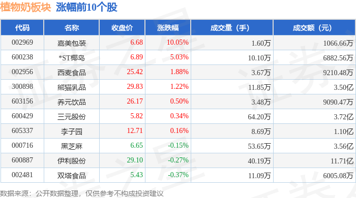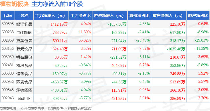 从资金流向上来看,当日植物奶板块主力资金净流出2.04亿元,游资资金净流入1.01亿元,散户资金净流入1.03亿元。植物奶板块个股资金流向见下表: