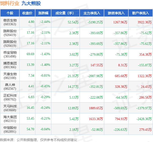 个股表现方面,饲料行业当日领跌股为傲农生物(603363),该股当日报收4.8,下跌2.44%,成交量52.54万,主力资金净流出5190.25万元。路斯股份(920419)以下跌2.11%紧随其后,该股当日成交量2.38万,主力资金净流出393.69万元。除此之外,路斯股份(920419)、乖宝宠物(301498)、播恩集团(001366)均进入当日熊股之列。具体个股列表见下表: