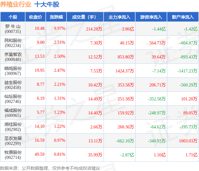 个股表现方面,养殖业行业当日领涨股为罗 牛 山(000735),该股当日报收10.48,上涨9.97%,成交量214.28万,主力资金净流入2.86亿元。民和股份(002234)以上涨2.51%紧随其后,该股当日成交量7.3万,主力资金净流入40.15万元。除此之外,京基智农(000048)、晓鸣股份(300967)、益生股份(002458)均进入当日牛股之列。具体个股列表见下表: