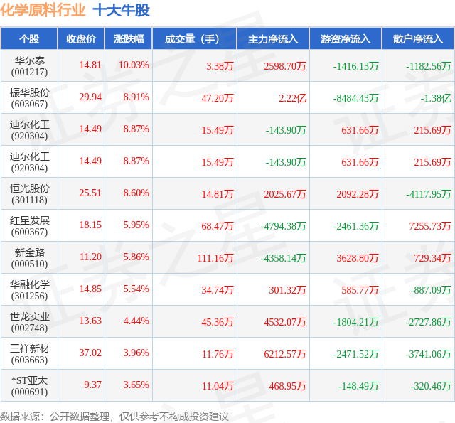 个股表现方面,化学原料行业当日领涨股为华尔泰(001217),该股当日报收14.81,上涨10.03%,成交量3.38万,主力资金净流入2598.7万元。振华股份(603067)以上涨8.91%紧随其后,该股当日成交量47.2万,主力资金净流入2.22亿元。除此之外,迪尔化工(920304)、迪尔化工(920304)、恒光股份(301118)均进入当日牛股之列。具体个股列表见下表: