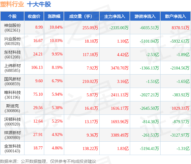 个股表现方面,塑料行业当日领涨股为神剑股份(002361),该股当日报收8.99,上涨10.04%,成交量255.09万,主力资金净流出2335.0万元。兴业股份(603928)以上涨10.03%紧随其后,该股当日成交量18.1万,主力资金净流入1.1亿元。除此之外,东材科技(601208)、上纬新材(688585)、国风新材(000859)均进入当日牛股之列。具体个股列表见下表: