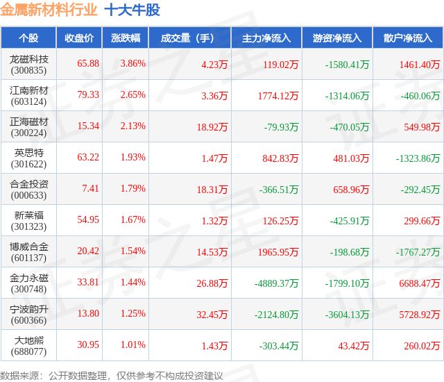 个股表现方面,金属新材料行业当日领涨股为龙磁科技(300835),该股当日报收65.88,上涨3.86%,成交量4.23万,主力资金净流入119.02万元。江南新材(603124)以上涨2.65%紧随其后,该股当日成交量3.36万,主力资金净流入1774.12万元。除此之外,正海磁材(300224)、英思特(301622)、合金投资(000633)均进入当日牛股之列。具体个股列表见下表:
