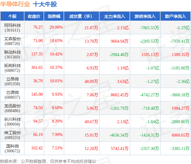 个股表现方面,半导体行业当日领涨股为珂玛科技(301611),该股当日报收76.27,上涨20.0%,成交量21.87万,主力资金净流入2.15亿元。艾森股份(688720)以上涨18.65%紧随其后,该股当日成交量13.7万,主力资金净流入9664.94万元。除此之外,联动科技(301369)、拓荆科技(688072)、立昂微(605358)均进入当日牛股之列。具体个股列表见下表: