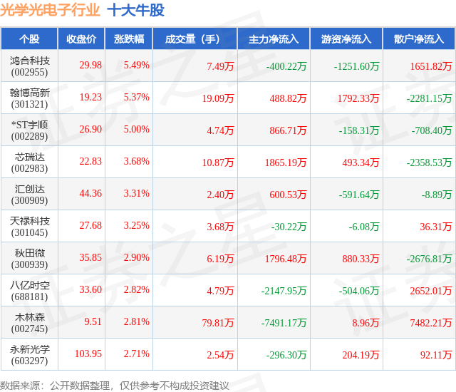个股表现方面,光学光电子行业当日领涨股为鸿合科技(002955),该股当日报收29.98,上涨5.49%,成交量7.49万,主力资金净流出400.22万元。翰博高新(301321)以上涨5.37%紧随其后,该股当日成交量19.09万,主力资金净流入488.82万元。除此之外,*ST宇顺(002289)、芯瑞达(002983)、汇创达(300909)均进入当日牛股之列。具体个股列表见下表: