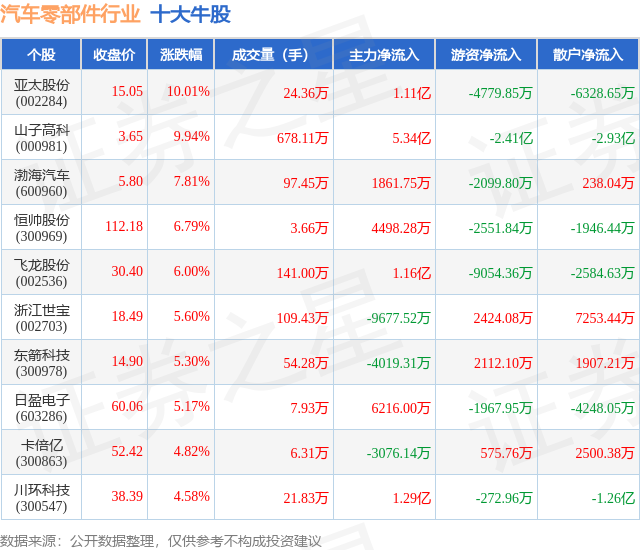 个股表现方面,汽车零部件行业当日领涨股为亚太股份(002284),该股当日报收15.05,上涨10.01%,成交量24.36万,主力资金净流入1.11亿元。山子高科(000981)以上涨9.94%紧随其后,该股当日成交量678.11万,主力资金净流入5.34亿元。除此之外,渤海汽车(600960)、恒帅股份(300969)、飞龙股份(002536)均进入当日牛股之列。具体个股列表见下表: