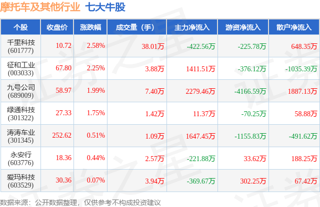 个股表现方面,摩托车及其他行业当日领涨股为千里科技(601777),该股当日报收10.72,上涨2.58%,成交量38.01万,主力资金净流出422.56万元。征和工业(003033)以上涨2.25%紧随其后,该股当日成交量3.88万,主力资金净流入1411.51万元。除此之外,九号公司(689009)、绿通科技(301322)、涛涛车业(301345)均进入当日牛股之列。具体个股列表见下表: