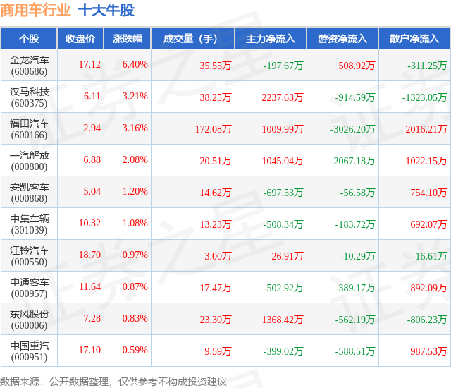 个股表现方面,商用车行业当日领涨股为金龙汽车(600686),该股当日报收17.12,上涨6.4%,成交量35.55万,主力资金净流出197.67万元。汉马科技(600375)以上涨3.21%紧随其后,该股当日成交量38.25万,主力资金净流入2237.63万元。除此之外,福田汽车(600166)、一汽解放(000800)、安凯客车(000868)均进入当日牛股之列。具体个股列表见下表: