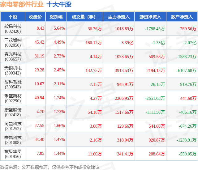 个股表现方面,家电零部件行业当日领涨股为毅昌科技(002420),该股当日报收8.43,上涨5.64%,成交量36.26万,主力资金净流入1018.89万元。三花智控(002050)以上涨4.49%紧随其后,该股当日成交量180.12万,主力资金净流入3.39亿元。除此之外,春光科技(603657)、天银机电(300342)、朗科智能(300543)均进入当日牛股之列。具体个股列表见下表: