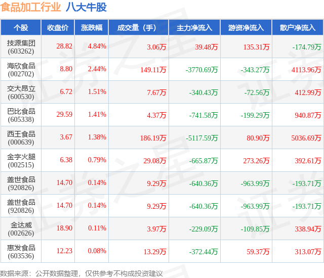 个股表现方面,食品加工行业当日领涨股为技源集团(603262),该股当日报收28.82,上涨4.84%,成交量3.06万,主力资金净流入39.48万元。海欣食品(002702)以上涨2.44%紧随其后,该股当日成交量149.11万,主力资金净流出3770.69万元。除此之外,交大昂立(600530)、巴比食品(605338)、西王食品(000639)均进入当日牛股之列。具体个股列表见下表: