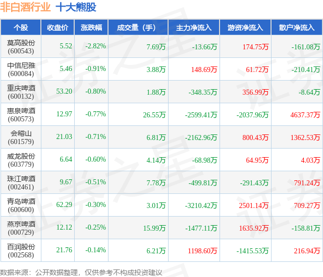 个股表现方面,非白酒行业当日领跌股为莫高股份(600543),该股当日报收5.52,下跌2.82%,成交量7.69万,主力资金净流出13.66万元。中信尼雅(600084)以下跌0.91%紧随其后,该股当日成交量3.88万,主力资金净流入148.69万元。除此之外,重庆啤酒(600132)、惠泉啤酒(600573)、会稽山(601579)均进入当日熊股之列。具体个股列表见下表: