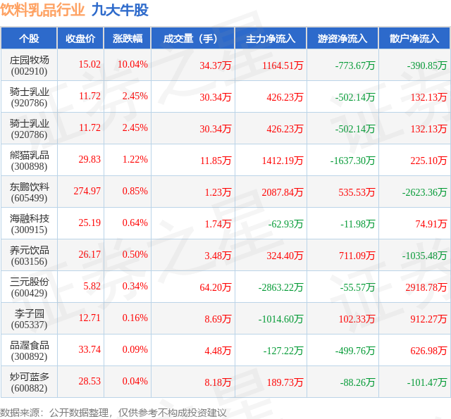 个股表现方面,饮料乳品行业当日领涨股为庄园牧场(002910),该股当日报收15.02,上涨10.04%,成交量34.37万,主力资金净流入1164.51万元。骑士乳业(920786)以上涨2.45%紧随其后,该股当日成交量30.34万,主力资金净流入426.23万元。除此之外,骑士乳业(920786)、熊猫乳品(300898)、东鹏饮料(605499)均进入当日牛股之列。具体个股列表见下表: