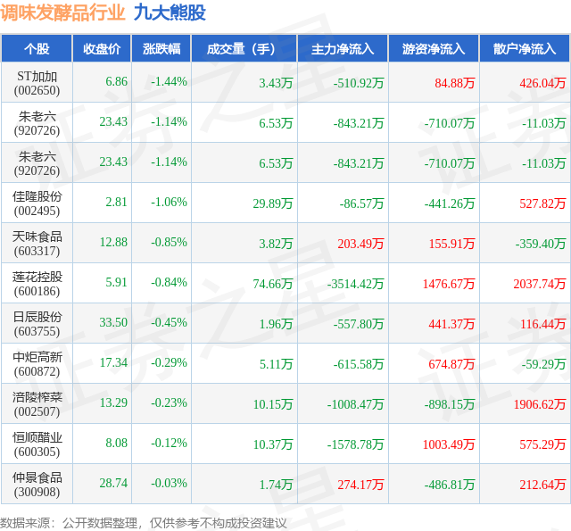 个股表现方面,调味发酵品行业当日领跌股为ST加加(002650),该股当日报收6.86,下跌1.44%,成交量3.43万,主力资金净流出510.92万元。朱老六(920726)以下跌1.14%紧随其后,该股当日成交量6.53万,主力资金净流出843.21万元。除此之外,朱老六(920726)、佳隆股份(002495)、天味食品(603317)均进入当日熊股之列。具体个股列表见下表: