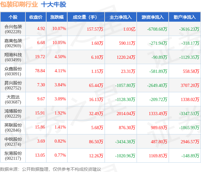 个股表现方面,包装印刷行业当日领涨股为合兴包装(002228),该股当日报收4.92,上涨10.07%,成交量157.57万,主力资金净流入1.03亿元。嘉美包装(002969)以上涨10.05%紧随其后,该股当日成交量1.6万,主力资金净流入590.11万元。除此之外,翔港科技(603499)、众鑫股份(603091)、昇兴股份(002752)均进入当日牛股之列。具体个股列表见下表: