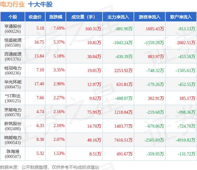个股表现方面,电力行业当日领涨股为亨通股份(600226),该股当日报收5.18,上涨7.69%,成交量160.31万,主力资金净流出881.9万元。恒盛能源(605580)以上涨5.37%紧随其后,该股当日成交量10.81万,主力资金净流出1043.24万元。除此之外,百通能源(001376)、桂冠电力(600236)、华光环能(600475)均进入当日牛股之列。具体个股列表见下表: