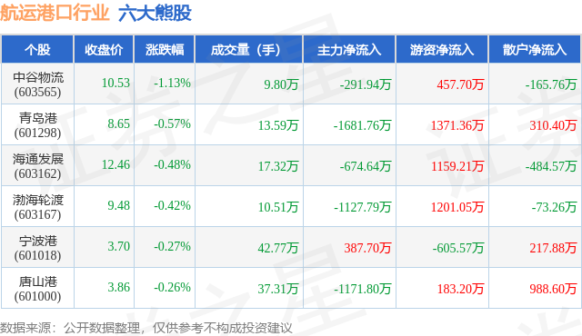 个股表现方面,航运港口行业当日领跌股为中谷物流(603565),该股当日报收10.53,下跌1.13%,成交量9.8万,主力资金净流出291.94万元。青岛港(601298)以下跌0.57%紧随其后,该股当日成交量13.59万,主力资金净流出1681.76万元。除此之外,海通发展(603162)、渤海轮渡(603167)、宁波港(601018)均进入当日熊股之列。具体个股列表见下表: