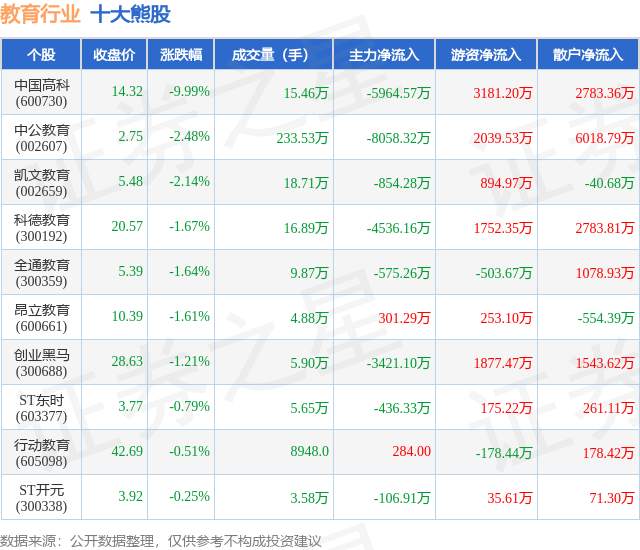 个股表现方面,教育行业当日领跌股为中国高科(600730),该股当日报收14.32,下跌9.99%,成交量15.46万,主力资金净流出5964.57万元。中公教育(002607)以下跌2.48%紧随其后,该股当日成交量233.53万,主力资金净流出8058.32万元。除此之外,凯文教育(002659)、科德教育(300192)、全通教育(300359)均进入当日熊股之列。具体个股列表见下表: