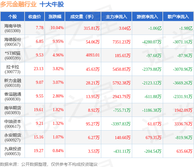 个股表现方面,多元金融行业当日领涨股为海南华铁(603300),该股当日报收7.78,上涨10.04%,成交量315.81万,主力资金净流入3.04亿元。海德股份(000567)以上涨9.95%紧随其后,该股当日成交量54.06万,主力资金净流入7351.23万元。除此之外,*ST熊猫(600599)、拉卡拉(300773)、新力金融(600318)均进入当日牛股之列。具体个股列表见下表: