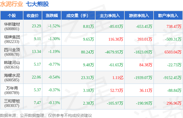 个股表现方面,水泥行业当日领跌股为华新建材(600801),该股当日报收23.29,下跌1.52%,成交量8.81万,主力资金净流出85.03万元。塔牌集团(002233)以下跌1.3%紧随其后,该股当日成交量9.65万,主力资金净流入116.3万元。除此之外,四川金顶(600678)、韩建河山(603616)、海螺水泥(600585)均进入当日熊股之列。具体个股列表见下表: