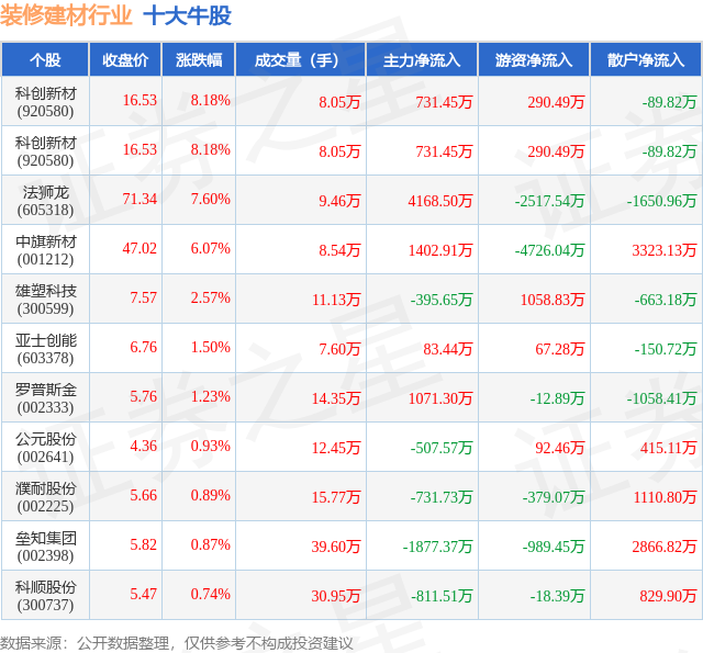 个股表现方面,装修建材行业当日领涨股为科创新材(920580),该股当日报收16.53,上涨8.18%,成交量8.05万,主力资金净流入731.45万元。科创新材(920580)以上涨8.18%紧随其后,该股当日成交量8.05万,主力资金净流入731.45万元。除此之外,法狮龙(605318)、中旗新材(001212)、雄塑科技(300599)均进入当日牛股之列。具体个股列表见下表: