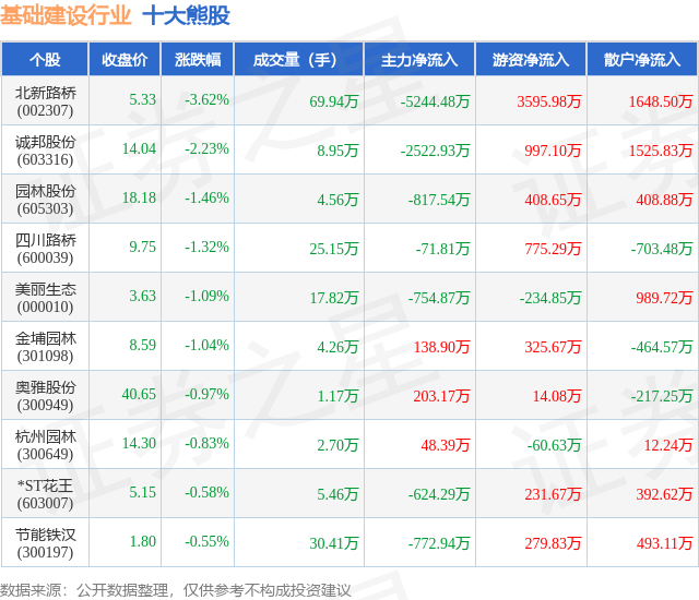 个股表现方面,基础建设行业当日领跌股为北新路桥(002307),该股当日报收5.33,下跌3.62%,成交量69.94万,主力资金净流出5244.48万元。诚邦股份(603316)以下跌2.23%紧随其后,该股当日成交量8.95万,主力资金净流出2522.93万元。除此之外,园林股份(605303)、四川路桥(600039)、美丽生态(000010)均进入当日熊股之列。具体个股列表见下表: