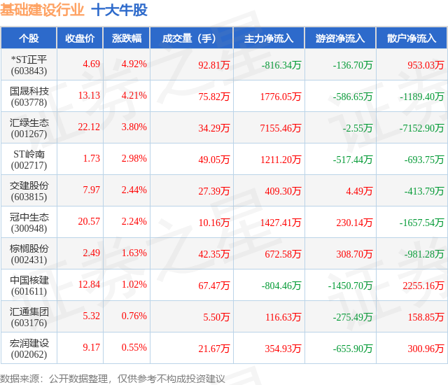 个股表现方面,基础建设行业当日领涨股为*ST正平(603843),该股当日报收4.69,上涨4.92%,成交量92.81万,主力资金净流出816.34万元。国晟科技(603778)以上涨4.21%紧随其后,该股当日成交量75.82万,主力资金净流入1776.05万元。除此之外,汇绿生态(001267)、ST岭南(002717)、交建股份(603815)均进入当日牛股之列。具体个股列表见下表: