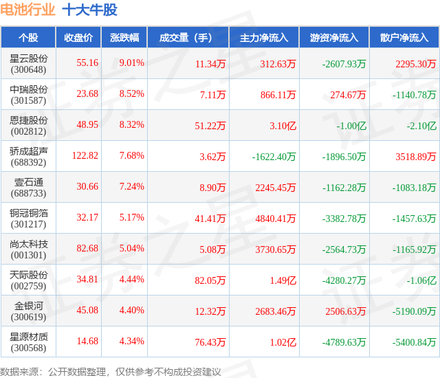 个股表现方面,电池行业当日领涨股为星云股份(300648),该股当日报收55.16,上涨9.01%,成交量11.34万,主力资金净流入312.63万元。中瑞股份(301587)以上涨8.52%紧随其后,该股当日成交量7.11万,主力资金净流入866.11万元。除此之外,恩捷股份(002812)、骄成超声(688392)、壹石通(688733)均进入当日牛股之列。具体个股列表见下表: