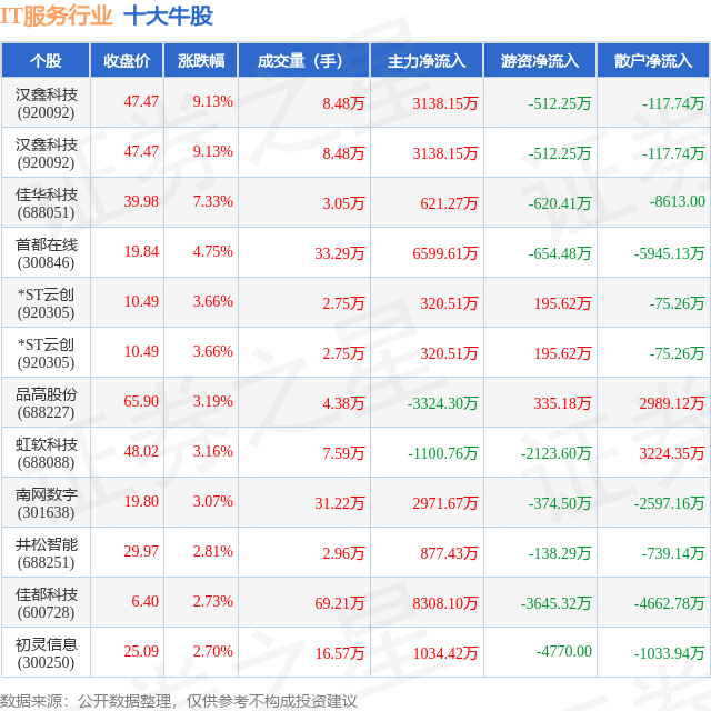 个股表现方面,IT服务行业当日领涨股为汉鑫科技(920092),该股当日报收47.47,上涨9.13%,成交量8.48万,主力资金净流入3138.15万元。汉鑫科技(920092)以上涨9.13%紧随其后,该股当日成交量8.48万,主力资金净流入3138.15万元。除此之外,佳华科技(688051)、首都在线(300846)、*ST云创(920305)均进入当日牛股之列。具体个股列表见下表: