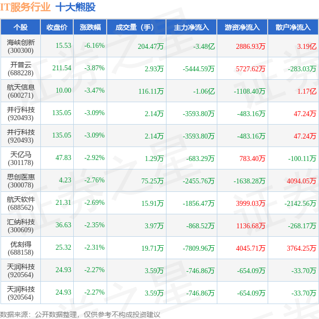 个股表现方面,IT服务行业当日领跌股为海峡创新(300300),该股当日报收15.53,下跌6.16%,成交量204.47万,主力资金净流出3.48亿元。开普云(688228)以下跌3.87%紧随其后,该股当日成交量2.93万,主力资金净流出5444.59万元。除此之外,航天信息(600271)、并行科技(920493)、并行科技(920493)均进入当日熊股之列。具体个股列表见下表: