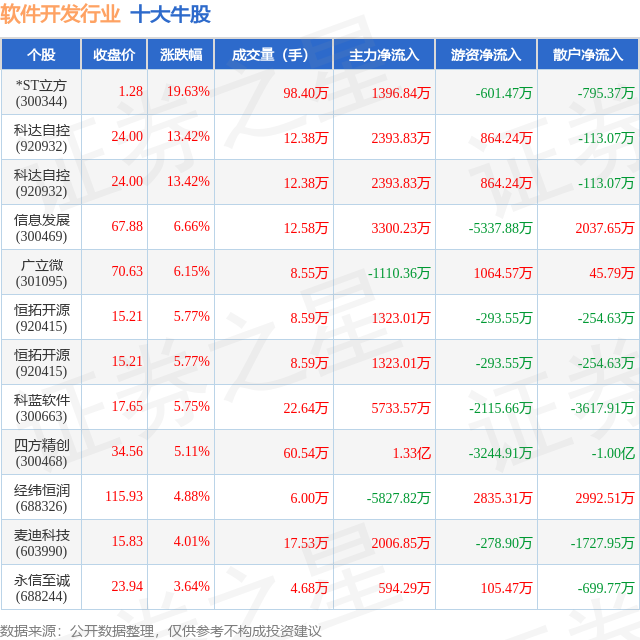 个股表现方面,软件开发行业当日领涨股为*ST立方(300344),该股当日报收1.28,上涨19.63%,成交量98.4万,主力资金净流入1396.84万元。科达自控(920932)以上涨13.42%紧随其后,该股当日成交量12.38万,主力资金净流入2393.83万元。除此之外,科达自控(920932)、信息发展(300469)、广立微(301095)均进入当日牛股之列。具体个股列表见下表: