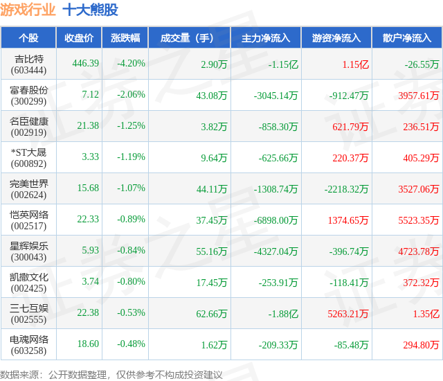 个股表现方面,游戏行业当日领跌股为吉比特(603444),该股当日报收446.39,下跌4.2%,成交量2.9万,主力资金净流出1.15亿元。富春股份(300299)以下跌2.06%紧随其后,该股当日成交量43.08万,主力资金净流出3045.14万元。除此之外,名臣健康(002919)、*ST大晟(600892)、完美世界(002624)均进入当日熊股之列。具体个股列表见下表: