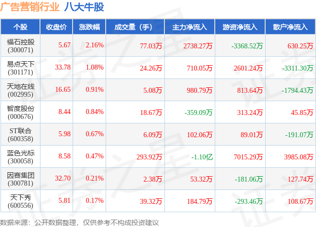 个股表现方面,广告营销行业当日领涨股为福石控股(300071),该股当日报收5.67,上涨2.16%,成交量77.03万,主力资金净流入2738.27万元。易点天下(301171)以上涨1.08%紧随其后,该股当日成交量24.26万,主力资金净流入710.05万元。除此之外,天地在线(002995)、智度股份(000676)、ST联合(600358)均进入当日牛股之列。具体个股列表见下表: