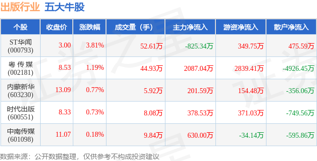 个股表现方面,出版行业当日领涨股为ST华闻(000793),该股当日报收3.0,上涨3.81%,成交量52.61万,主力资金净流出825.34万元。粤 传 媒(002181)以上涨1.19%紧随其后,该股当日成交量44.93万,主力资金净流入2087.04万元。除此之外,内蒙新华(603230)、时代出版(600551)、中南传媒(601098)均进入当日牛股之列。具体个股列表见下表: