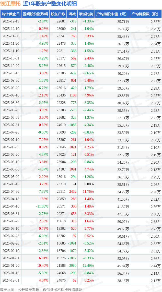 从股价来看,2025年12月10日至2025年12月19日,钱江摩托区间跌幅为2.04%,在此期间股东户数减少319.0户,减幅为1.39%。