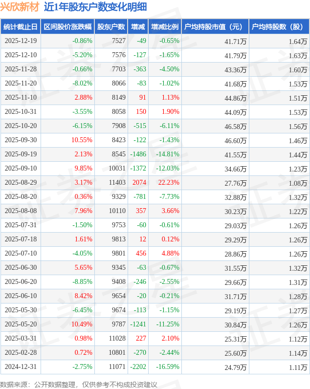 从股价来看,2025年12月10日至2025年12月19日,兴欣新材区间跌幅为0.86%,在此期间股东户数减少49.0户,减幅为0.65%。
